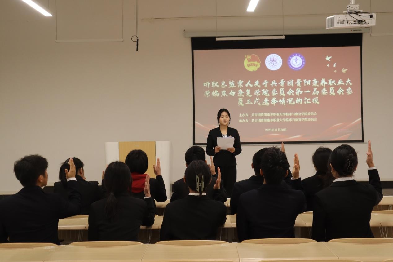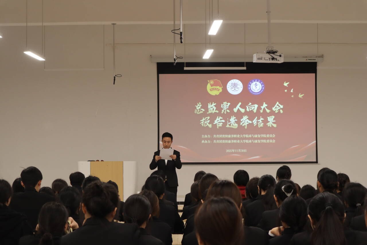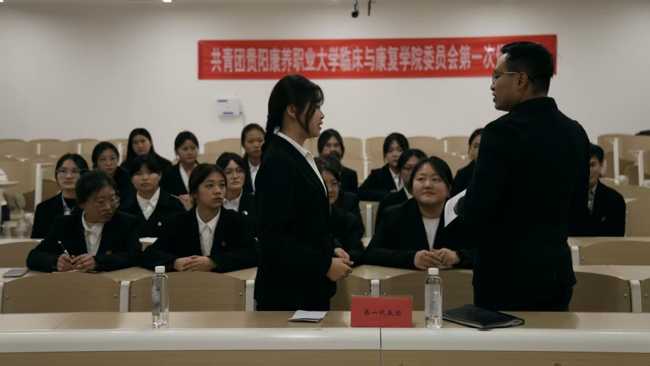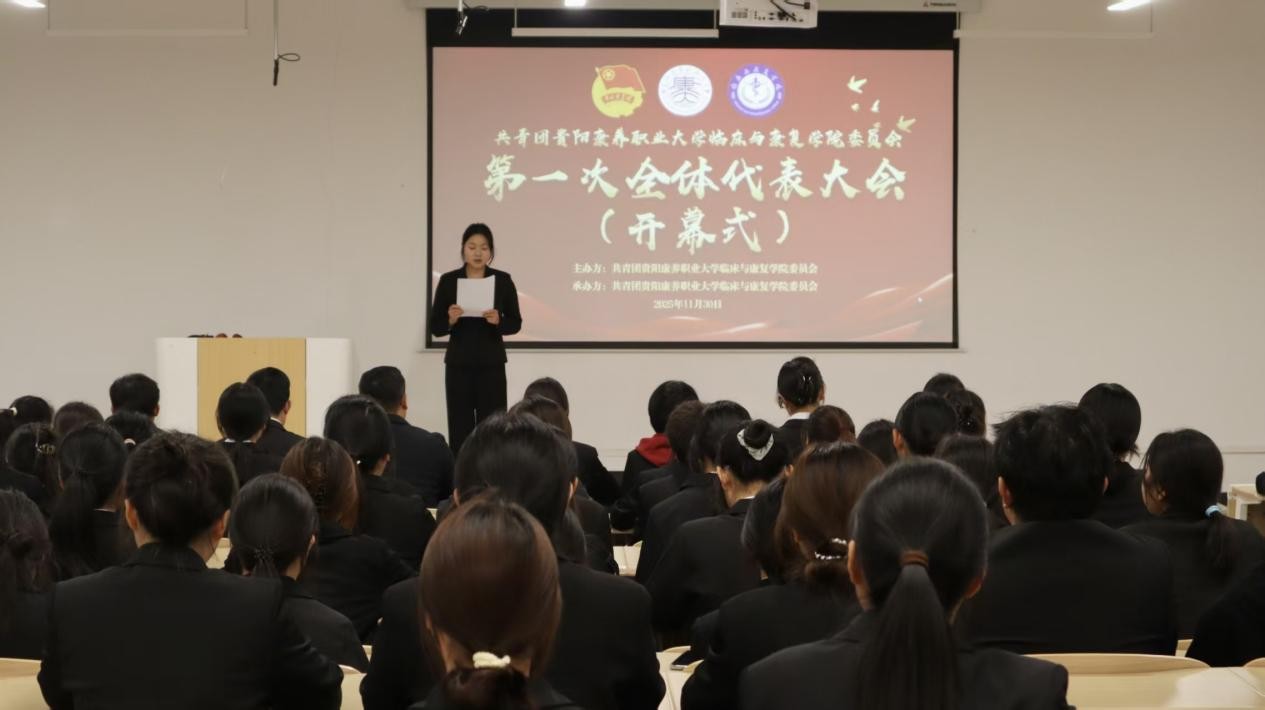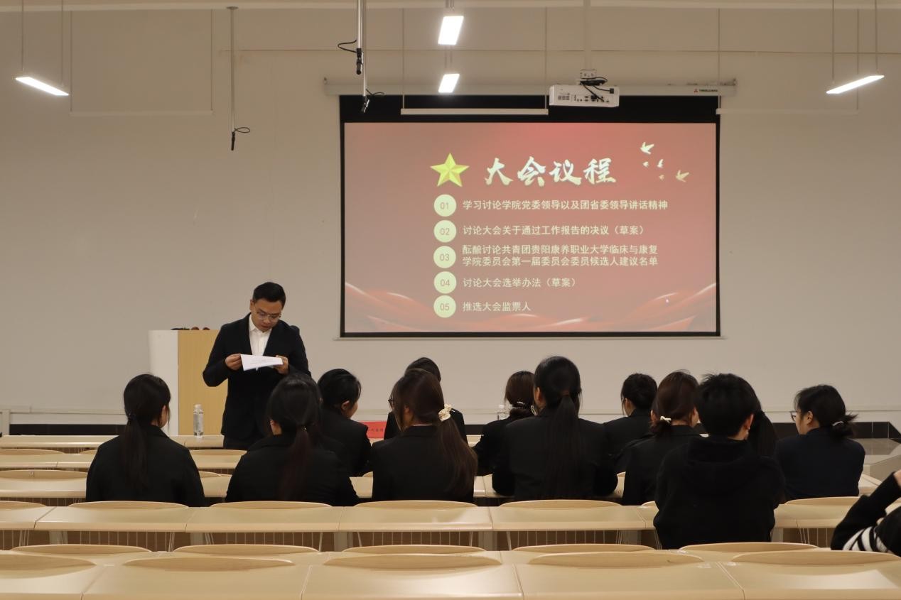 为深入贯彻共青团中央关于加强基层团组织建设的部署要求,凝聚青年力量、规范组织生活,2025年11月30日,共青团贵阳康养职业大学临床与康复学院第一次代表大会在新教学楼4-401、4-402教室隆重召开。院团委书记罗明鸿、副书记陈君,党员教师代表靳挺及全体团员代表齐聚一堂,共商学院共青团发展大计。历时三小时的大会议程紧凑、成果丰硕,在庄严氛围中圆满闭幕。