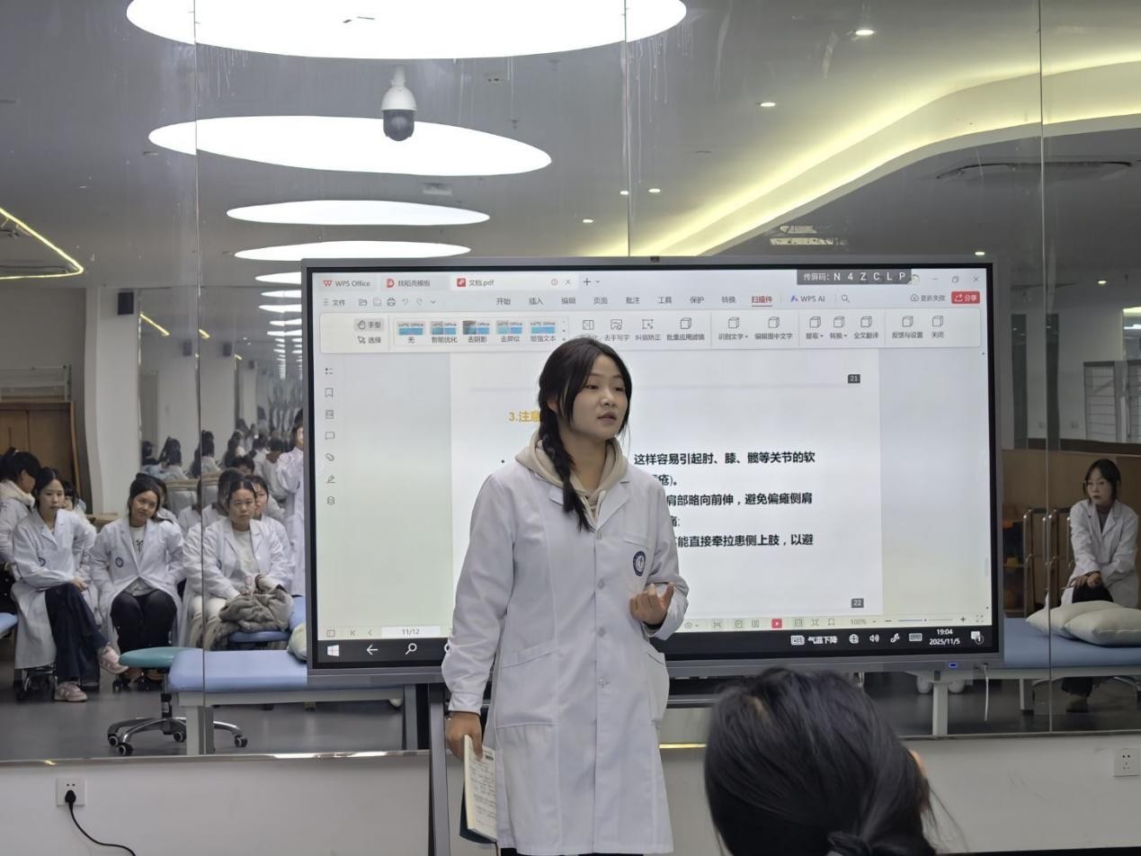 在理论讲解环节,副社长通过精心制作的多媒体课件,系统阐述了良肢位的基本概念、临床意义及操作要点。讲解内容深入浅出,不仅涵盖了良肢位在预防压疮、深静脉血栓等并发症方面的重要作用,还详细解析了不同体位下肢体摆放的科学依据。副社长特别强调了良肢位摆放的个性化原则,指出要根据患者的具体情况灵活调整。在随后的实践操作环节,同学们分成若干小组,在副社长的示范指导下,亲手练习使用枕头、软垫等辅助工具进行良肢位摆放。现场学习氛围浓厚,副社长耐心指导每个动作细节,及时纠正不当操作,确保每位参与者都能掌握正确的操作手法。同学们学习热情高涨,积极提问交流,互相切磋技艺,在反复练习中不断提升操作熟练度。整个培训过程注重理论与实践的紧密结合,通过案例分析、现场演示、分组练习等多种形式,使抽象的理论知识变得生动具体,易于理解和掌握,让同学们获益匪浅。