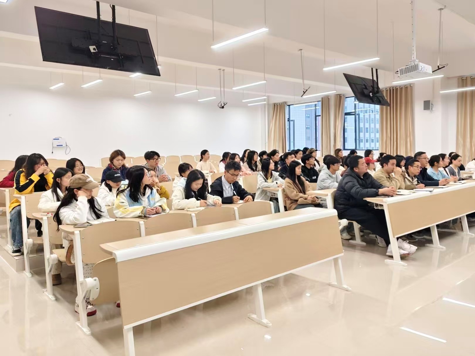 为深学细悟《习近平谈治国理政》第五卷,以党的创新理论引领医康养事业高质量发展,2025年10月29日,学院党委在新教学楼4-401举办专题宣讲会。活动由学院教师党支部书记段有发与学生宣讲员杨佳英共同主讲,学院党委书记张学桐、副院长秦皓,第一附属医院第四党支部书记龚海霞及双方党员师生代表、入党积极分子参加。