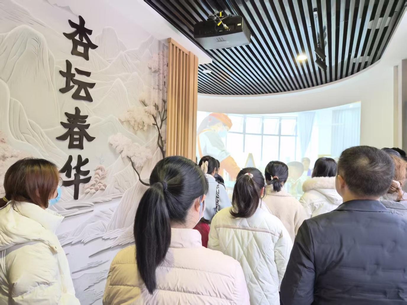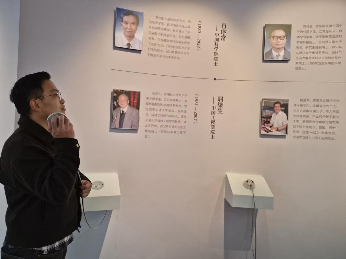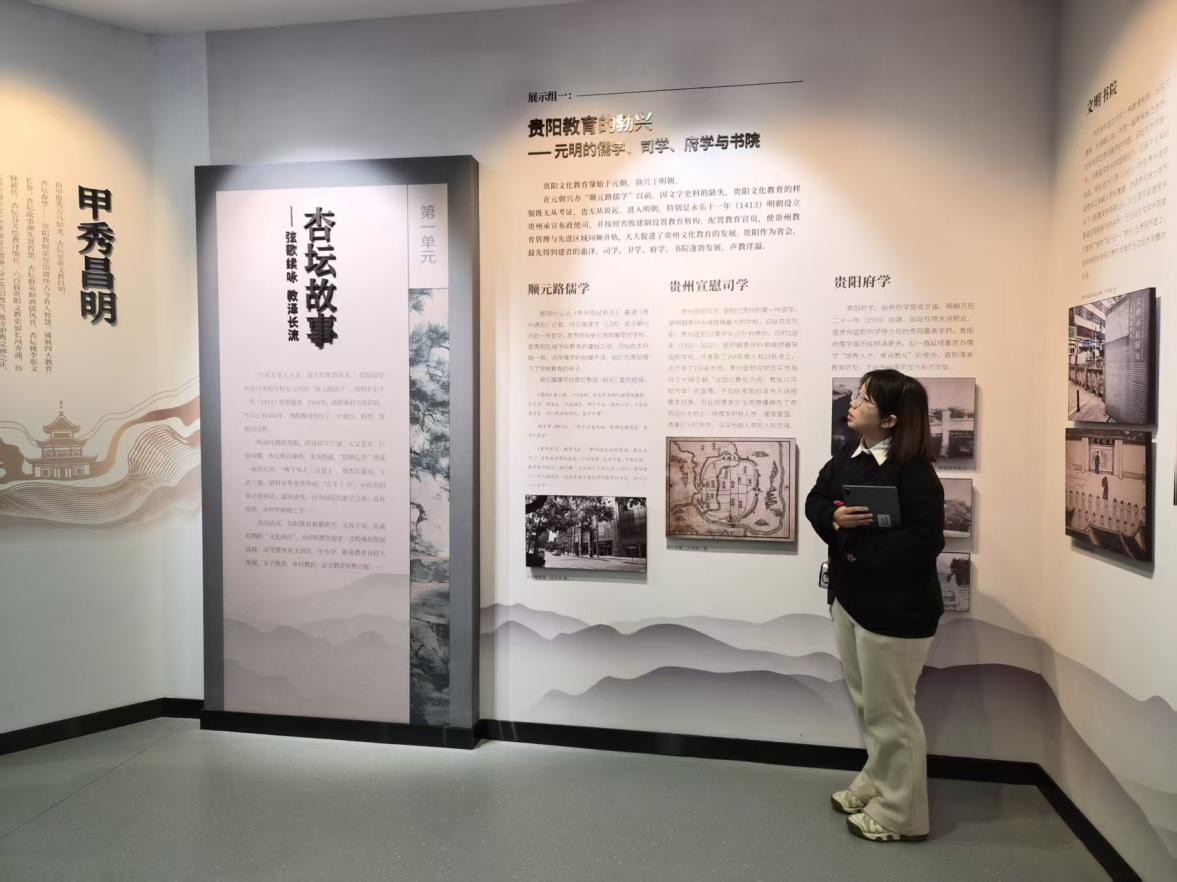随后,师生们依次走进“杏坛故事”“杏坛群英”“杏坛桃李”“杏坛芬芳”四大核心展区。在“杏坛故事”展厅,元朝至明清时期的教育文献、复刻教具及场景还原装置,生动呈现了贵阳教育的演进轨迹,师生们不时驻足观察、轻声交流,在触摸历史印记的过程中,加深了对本土教育传承的认知;步入“杏坛群英”单元,王阳明等教育先辈的育人理念、贵阳贵安优秀教师的感人事迹通过图文展板与电子触摸屏同步呈现,大家认真阅读事迹介绍,有的教师还特意拍下重点内容;在“杏坛桃李”展区,展示的院士、学者等杰出校友的成长故事与成就,让教师们深刻体会到“桃李不言,下自成蹊”的育人价值,更坚定了做好人才培养工作的决心;“杏坛芬芳”展厅里,近千所学校的建校老照片、毕业合影及校园宣传片,唤起了不少教师的教育记忆,现场氛围热烈。