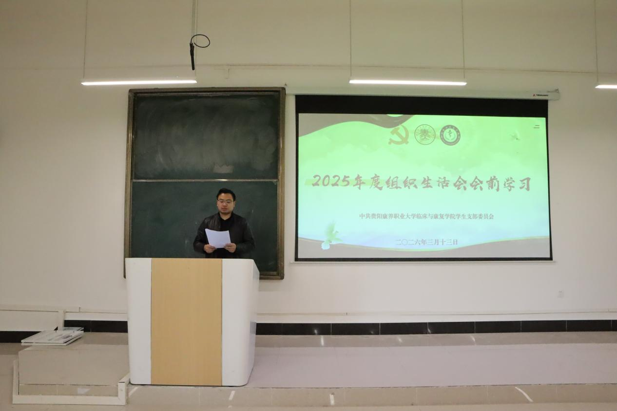 为深入落实校党委《关于召开2025年度组织生活会和开展民主评议党员工作的通知》要求,2026年3月13日,临床与康复学院学生党支部召开党员大会,开展2025年度组织生活会会前集中学习。会议紧扣“深入学习贯彻习近平新时代中国特色社会主义思想,全面贯彻落实党的二十届四中全会精神”主题,以优良作风凝心聚力,为开好组织生活会筑牢思想基础。